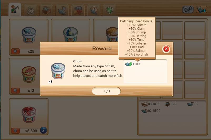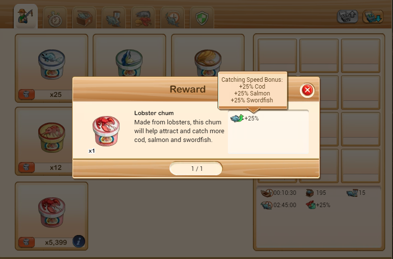 This brings us to the exception. Lobster chum. Lobster chum increases fishing speed of cod, salmon, and swordfish by 25%.