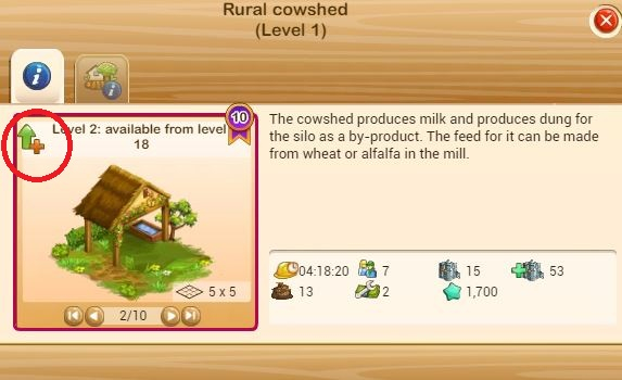 there are some places when a bldg is offered, if you hover your cursor over that green arrow, it reads what currency the building upgrades with ... for example, that arrow is on the spring & beach stables in the golden apple trader & hovering over it reads those will require golden apples to upgrade them