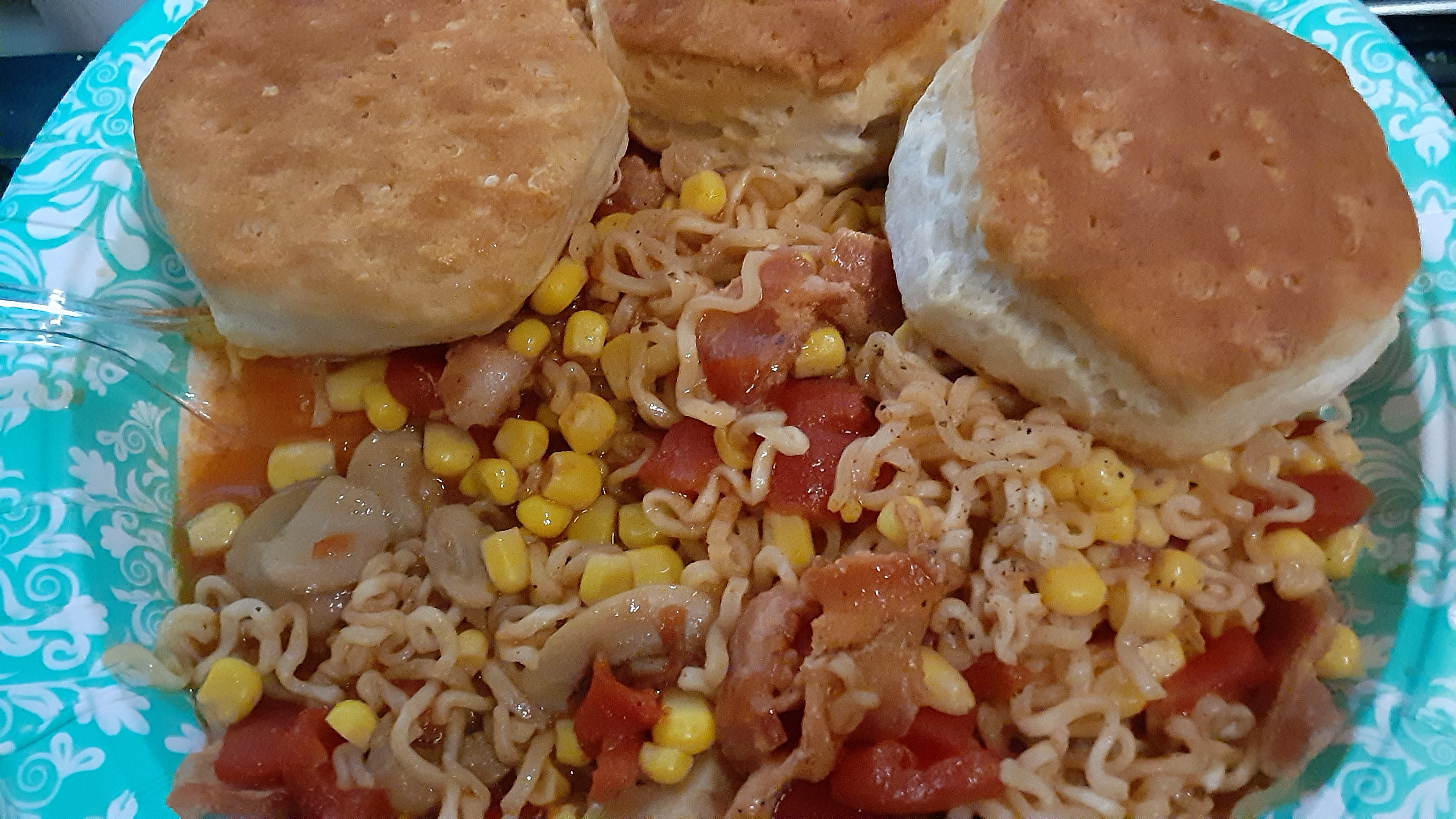 Step 2 >In the same frying pan I cooked the bacon in I added in the can of diced tomatoes, Mushroom's, & Ramon noodles with beef packages, water, Corn & let simmer until noodle's are soft & not stuck together.
