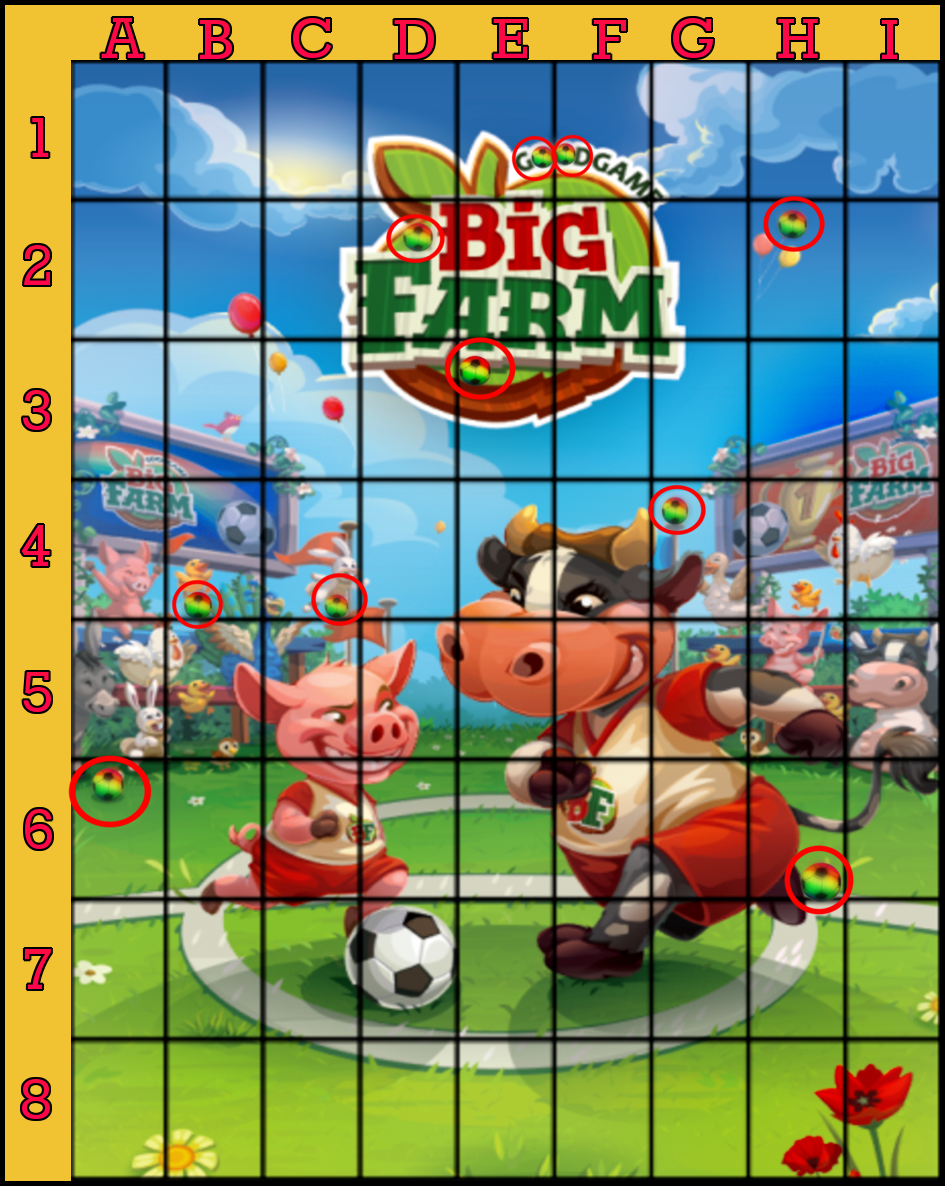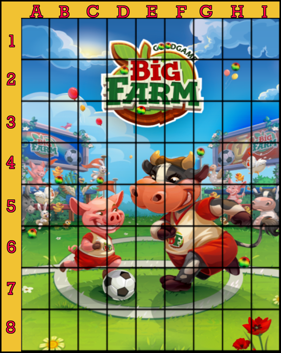 Enter the squares with colored footballs: letter first, then the number.