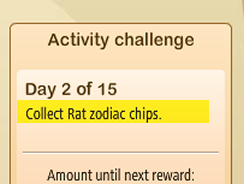 Voorbeeld: dinsdag 9/2 was de uitdaging 'verzamel RAT fiches'; dan loopt de teller van je 'werkbeloningen' dus alleen maar naarmate je RAT fiches verzamelt!! Alle fiches van de andere zodiac dieren tellen hier niet mee.