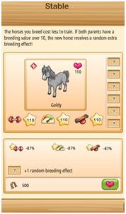 When you breed 2 horses in order to get a new foal, the parents leave to make space for the new generation. It is best to breed horses that are close in level (breeding value), because your foal's level will be the average of the parents' levels. Here are the benefits of that breeding: