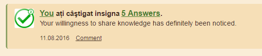 Also yesterday I got the 5-Answer badge, but weirdly got it awarded in romanian (had to google to figure out the language