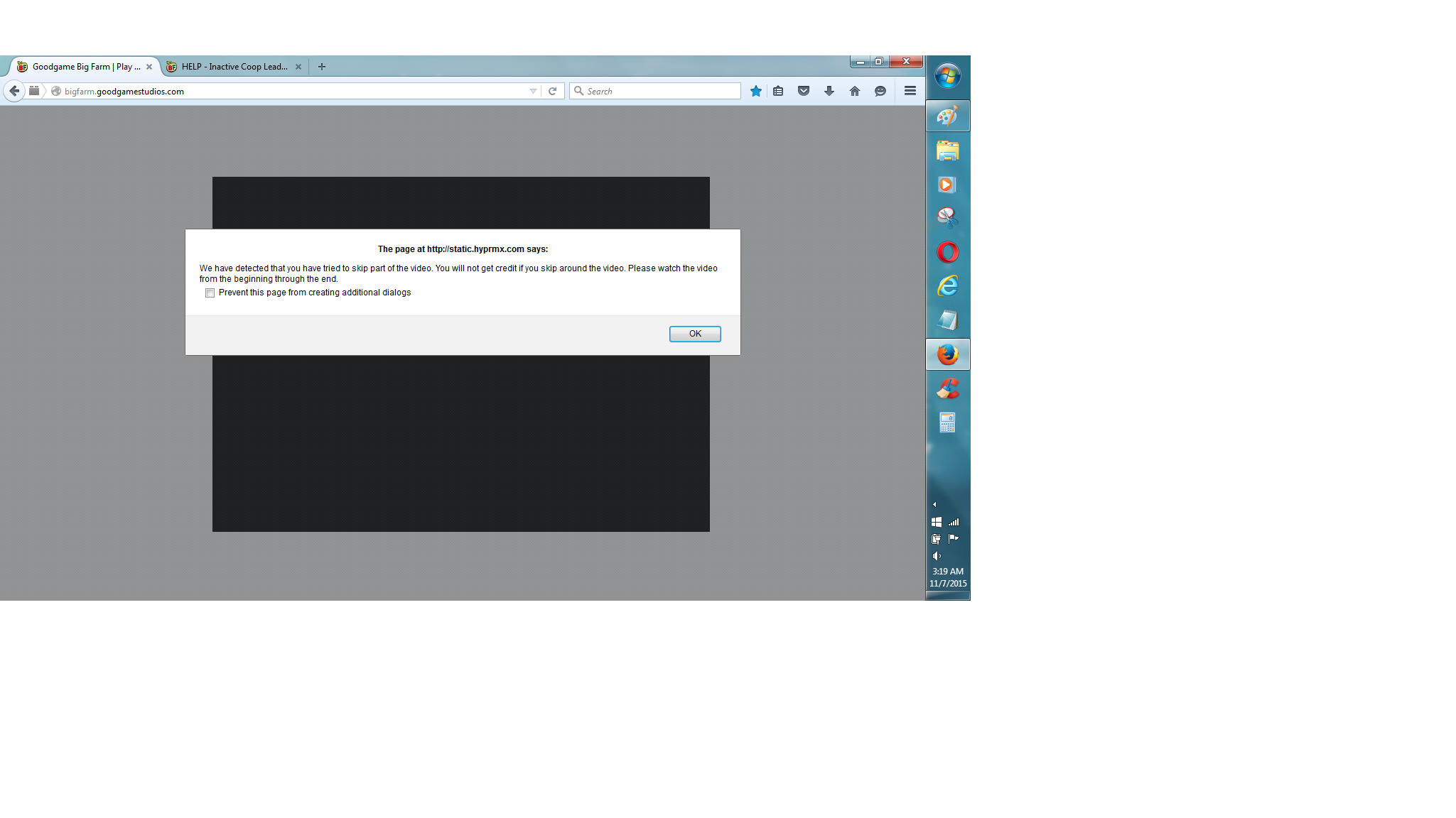 I can click on the video all I want, but nothing happens. The only option that remains is clicking the gray cross on the top right and get NO reward. When I close the browser, clear cache, etc nothing happens either....