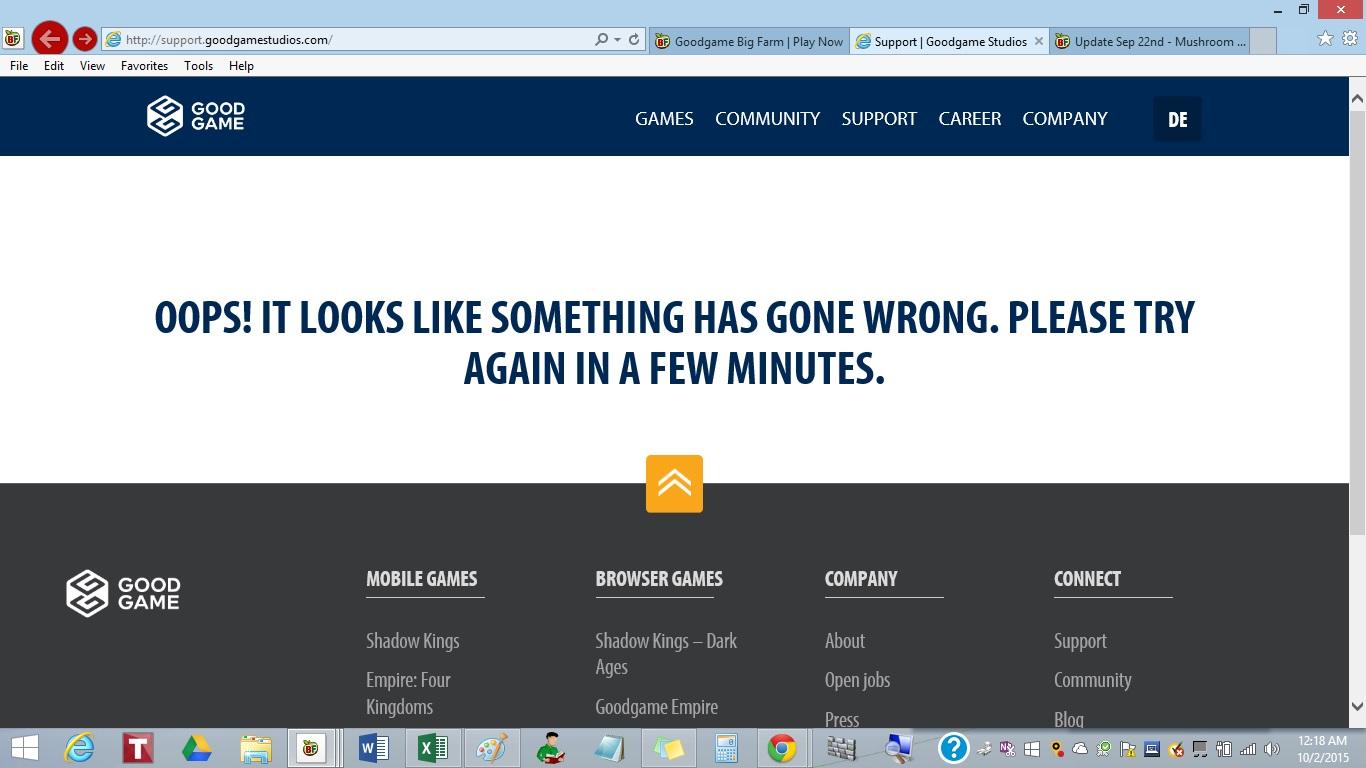 I've been trying to get in to support for over 3 hours and earlier today too to report another problem with the movies--and the mushroom problem now too and I just get the screen below now???? I also have not been getting any answers to my support requests. I have tried using internet explorer and google chrome, logged in and out, cleared flash and browser flashes, rebooted computer, etc. about an hour or so ago, I could not even get on to the forum, just got the farm picture, then nothing more.