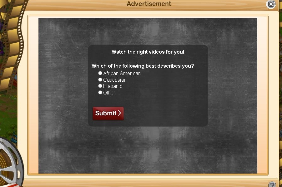 I shall no longer be watching videos. When I first started playing I purchased $5.00 worth of gold a month to help support the starving programmers, because I had noticed that there were no ads. Now that they're getting a little too personal, they can go hungry.