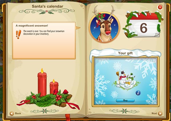 @DoctorX (INT1) Glad that reloading your game fixed your snowman, your screenshot was definately weird, because it had a buy button instead of green check mark, as though you had not started the event, but it was showing the snowman family lol ... I guess it wouldn`t be a BF event if there wasn`t some weirdness thrown in hehe