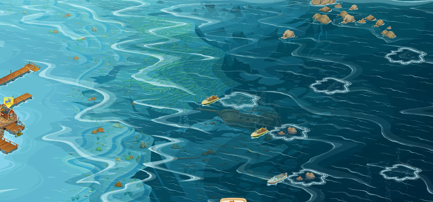 The equipment for deep sea fishing is not organized. The equipment and people shop should display the amount stored and the current stored items should be organized by type.