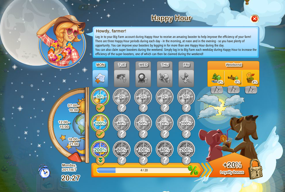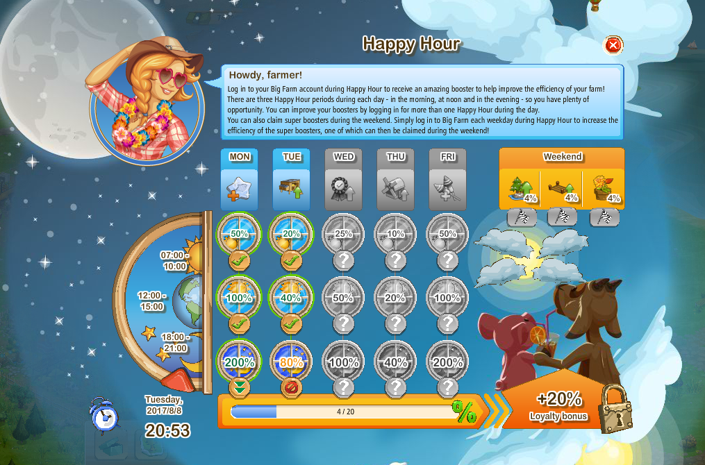 While this one shows what happens if you can't online during happy hour period once (I can't be online in the noon (5-8 p.m. in my zone), so the evening login (11 p.m.-2 a.m. in my zone) is treated as I login in the noon)
