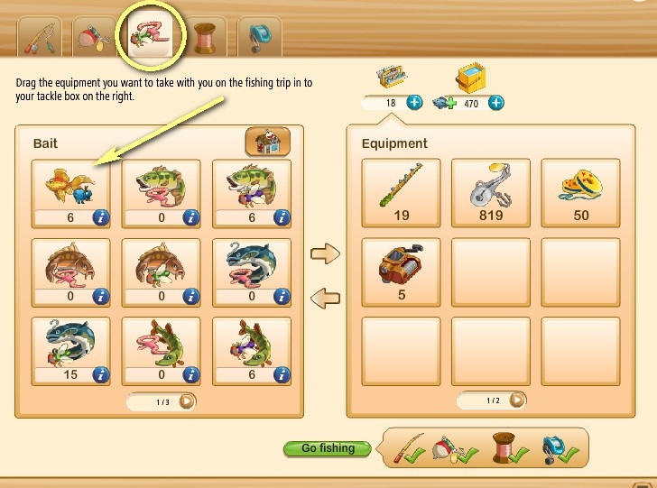 You then equip that bait in Oleg's tackle box, and go fishing in the mini-game. Use the bait while fishing to spawn a goldfish, then catch it just as you would any other fish. Caught goldfish are automatically placed into the goldfish bowl.