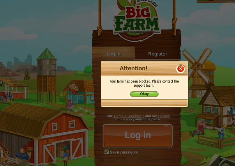 i was playing at 12.28pm.. 21 dec 2017.. and suddendly my farm disconneted.. now i am trying to log in.. and its saying i am blocked,,,plz remove this bug..