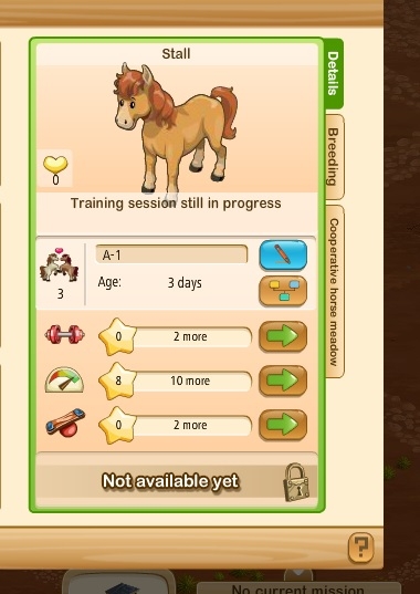 When I go to the horse stable to breed with a horse of a similar level with no horse meadow attributes, the new horse that would be generated only displays horse training attributes that are half the training earned by the previous horse (ie endurance training down to +2 for new horse and racing down to +2).