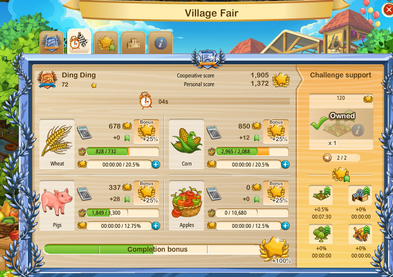 In a nutshell, the Village Fair seems to be a combination of a CC and a "Co-Op Wide Mission" - that is to say, each challenge doesn't need to be "Won" or "Finished" in order to gain "Challenge Points", but if you DO complete the challenge, you gain a multiplier to the number of challenge points you receive.