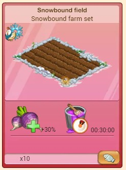 If I were to place this on an existing field on my farm, I would get a 30% bonus to Rutabagas for 30 minutes. After 30 minutes, the "Snowbound" look of the field goes *POOF* and I'm back to a regular looking field with no skin applied.