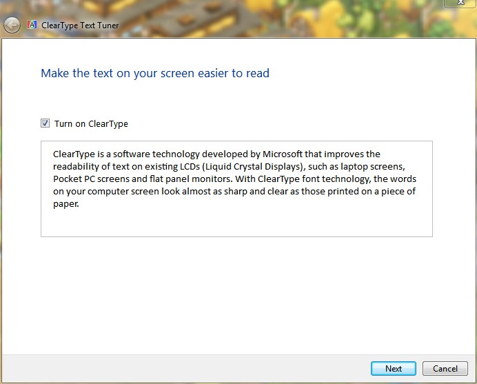 Make sure the box is checked for "Turn on ClearType", and press "Next" to run through the process of picking the "best looking" text for your particular display.