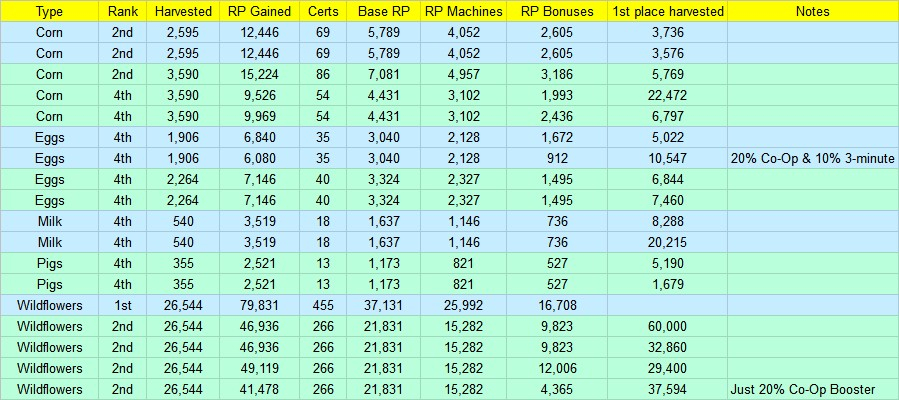 This is a sampling of some missions that I've grouped together by the amount of Corn, Eggs, Milk, Pigs & Wildflowers produced during the mission, where I *placed* in the mission, and how much RP I received. The overall RP varies a little, based on whether I qualified for the 10% Bonus or not, but you can see the by the "Base RP" column that the Base RP's match exactly, and was based solely on how much I harvested and where I ranked. RP Bonus includes a 20% Co-Op Booster, 25% Personal Booster, and sometimes a 10% "3-minute from last mission" booster.