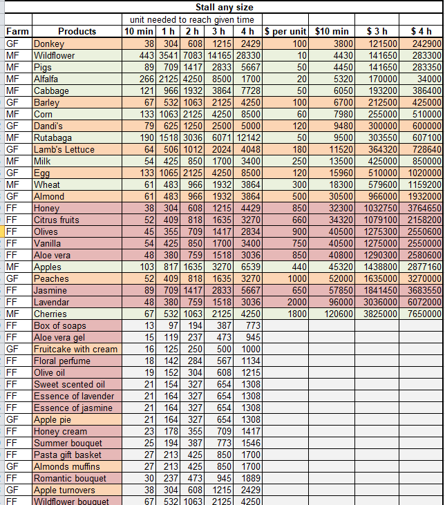 Im buying: Pigs, Donkeys, crops from MF and GF. I dont use seaweed. And i only use 4 hour stalls.
