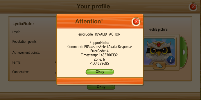 Now I have a new code Invalid Action which happened when I clicked on the vendor at the market and he was offering 10 liquid fertilizers for 5400 case I discovered that sometimes when they actually have the reward listed it gives you case as apposed to take away case when the reward is a mystery item.