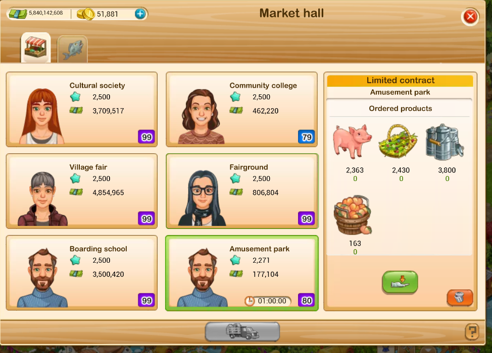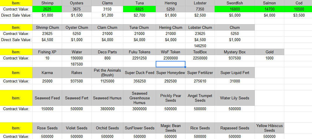 Now they all come with add ons. And the fish market has been nerfed as well. Before declining a contract, I compare what I would make just selling off the excess v. what I make with something useless or cheap added on. In the fish market, a recent add on was 2 violet seeds which deducted over $80,000 from the contract. I don't know anyone who would pay $80K for two violet seeds.