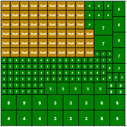 so with that said, I also have all the LVL 4, 5, 6, 7 and 8 deco requirements as well as 2x3, 3x3, 3x4 and 4x5 requirements. No way can I get the 5x5 and 6x5 requirements and will just ignore those stalls or if have to put down, will do for 10 minutes.... with my layout I can put in 40 3x3 stalls and should be able to do 1.4 million pps or better depending on stalls, only did a quick check at the end and did not get picky with stalls.