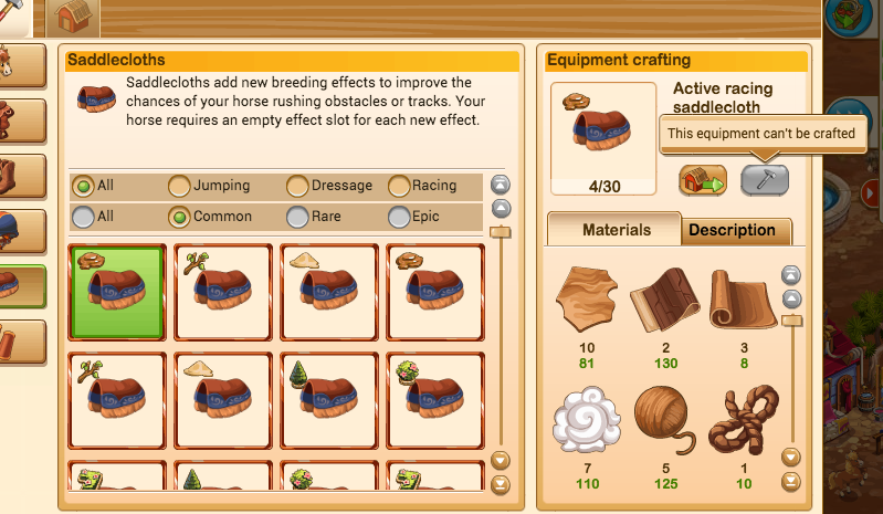 Trying to make saddlecloths.  "Equipment can't be crafted."  Of course doesn't say WHY.