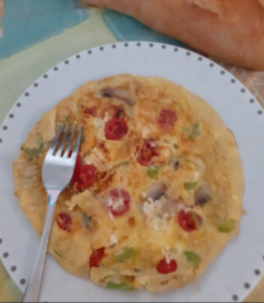I take some eggs scrambled with milk, some tomatoes, some peppers, add a few muchrooms if you have and grated cheese, salt and black pepper, mix them all together and put them in a hot frying pan with 2 tablespoons of olive oil , fry a few minutes from both sides and there you have the fluffiest omelette ever