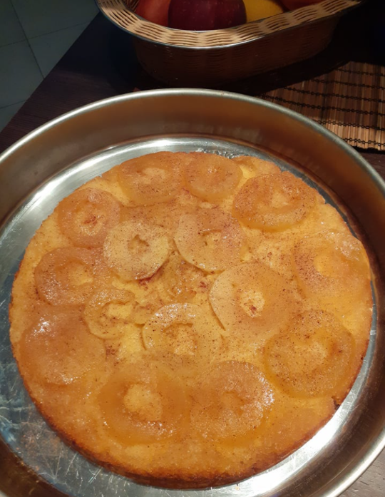 we take it out, and turn it upside down to onother bigger oven pan. In this way we are going to have a syrupy apple pie. let it cool and ready to taste it.