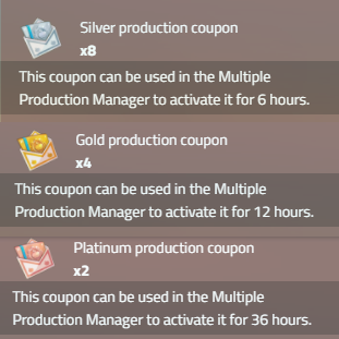 In terms of the coupons, the bronze one "unlocks" the Multiple Production Manager for 1 hour, silver 6H, gold 12H, platinum 36H.