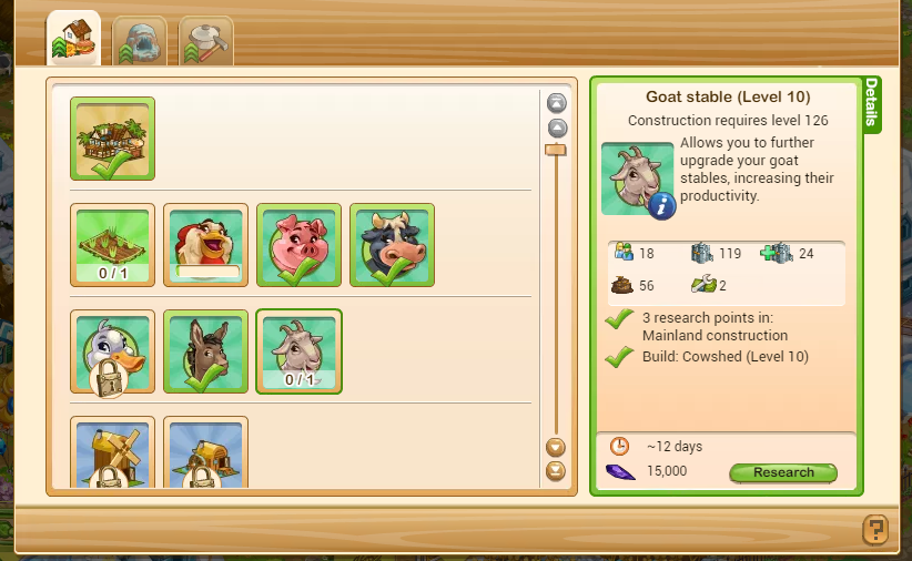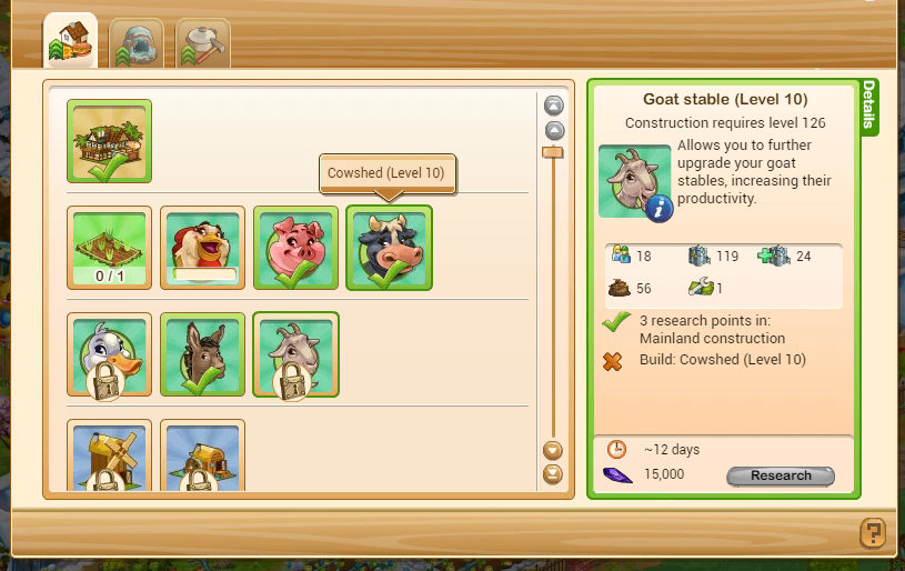 Also the cows to upgrade to level 10 can be the Big Cows...The big ducks and tiny ducks are acceptable for upgrading to level 10...So really any of the stables you can upgrade to level 10 after doing the research.