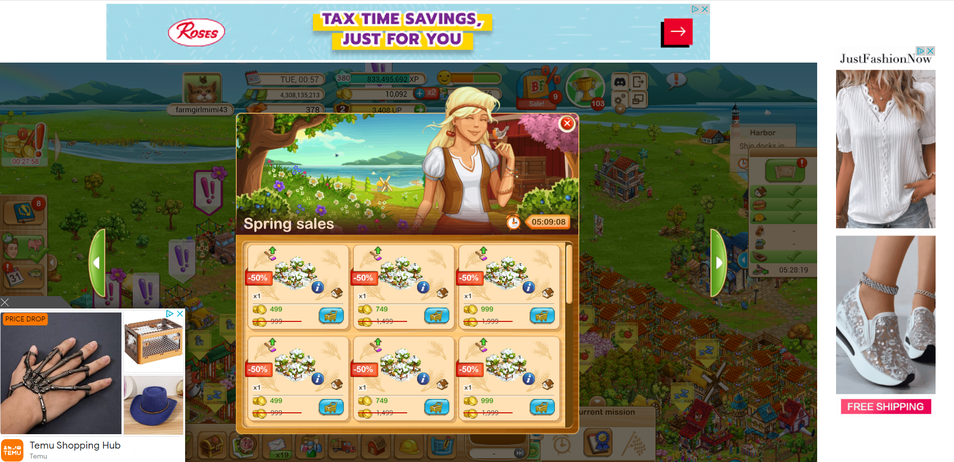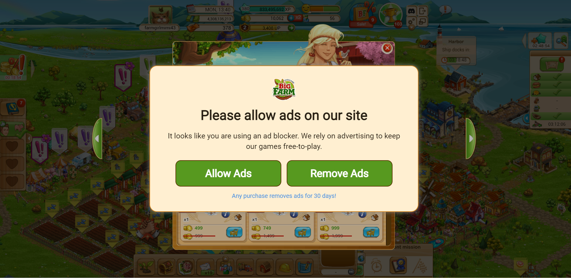 There are kind of only two ads blocking the game field above. The one in the lower left can be removed by clicking the 'X' above it; I find it might take it a couple of seconds to recognize you've clicked it; it will return though after so many minutes. The two in the middle of the game field (the 'Fixed Asset Pro' in the above example and the BF offer below it) are linked together, so they both show up and go away at the same time. They don't show up as often as the one in the lower left corner--this seems to happen when you reload the game and sometimes when you switch farms (e.g. going from Main to Gourmet). Also, they appear to be on a 30 second timer (or less), though I find if I click on the ad, a new tab appears in my Chrome browser showing the website related to the 'Fixed Asset Pro' ad, and the ad disappears from my BF game immediately. However, I realized today that it might not be such a good idea to click on the ad because that is often a way for viruses to infect your computer.
