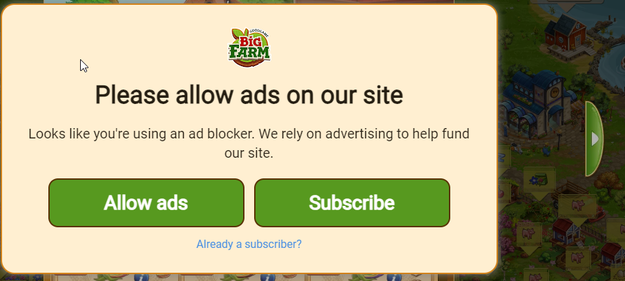 The trouble is I am playing on an old computer. My browser will crash if I have the ads running as well as the farm. The game is not playable this way, that is why I put the adblocker on in the first place. I am not allowing the ads, it would be pointless.