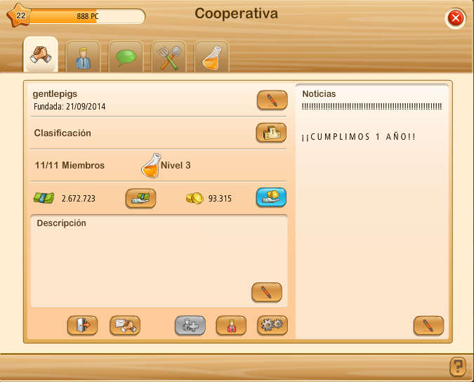 Hola compañeros, es que soy un poco torpe y mi comentario lo he colgado de en el sitio que no debía. Bueno si no lo habéis leído os comento que yo llevo menos de 1 año en este juego, inicialmente me incorporé o otra cooperativa, que no era muy activa, cada uno iba por su lado, hasta que fue invitado por Piggy Joan a incorporar con vosotros, por mi parte lo considero un acierto el poder formar parte de esta cooperativa.