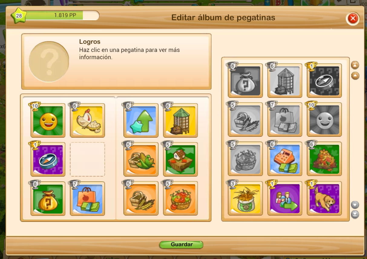 Para más información puedes consultar el apartado de la wiki de Big Farm donde habla de los logros y el álbum de pegatinas y en el listado que ves de los logros en esa página, si pinchas cada uno de esos títulos, te da todavía más información