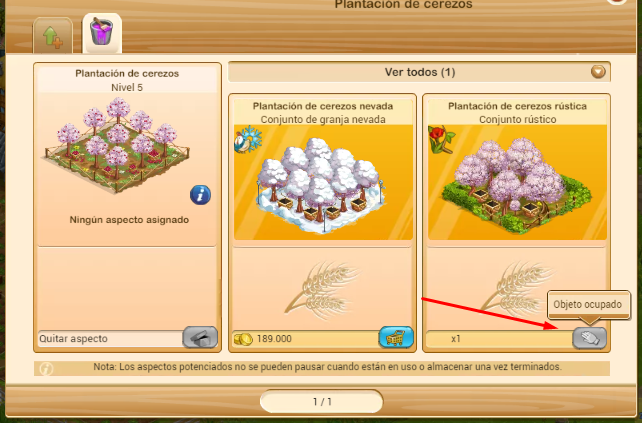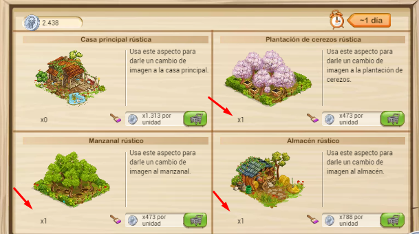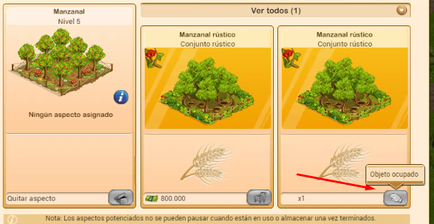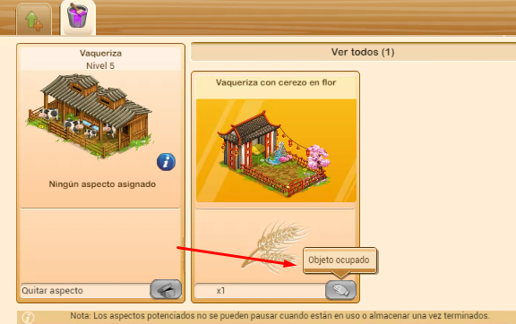 Lo más importante en este caso es que los 3 aspectos de vaquerizas rústicas que has comprado no las vas a perder. Las tienes ahí para utilizarlas en tus vaquerizas. Cuando una de ellas este desocupada, haz click sobre el botón que aparece en gris (con el guante blanco) y añadirás el aspecto rústico al edificio.