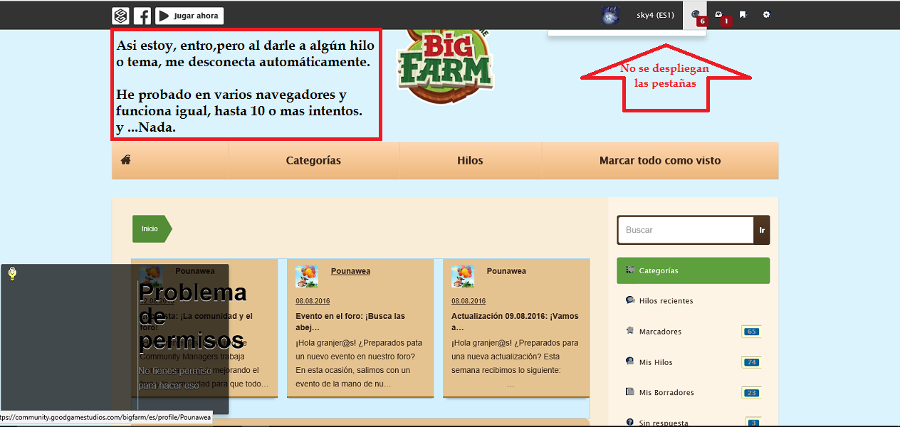 yo hace tiempo que no tengo problemas, pero si me daba, ponia contraseña y correo , entraba y cuando iba apostear me pasaba como a la compañera que comenta "no tienes permiso apra esta accion", te fijaste si arriba a manos derecha te sale algo asi como "iniciar sesion en la comunidad big farm? a mi me salia mi nik , pero no me dejaba hacer nada, clicaba en iniciar sesion en la comunidad y ya si me permitia hacer todas las acciones, procuro dejar la pestaña abierta del foro siempre, asi me evito el tener que escribir la contraseña muchas veces y logearme para poder entrar, la mantengo abierta y no me da problema saludos comunidad