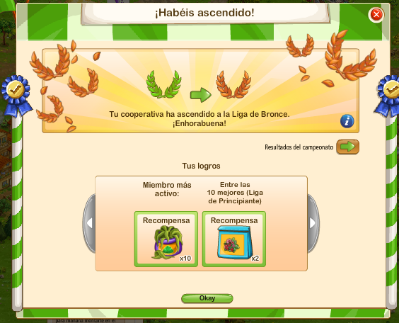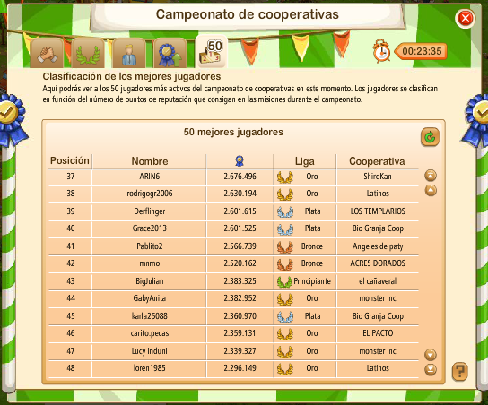 también quiero felicitar al grupo de big farm por mejorar los regalos ya que los semillas de oro fueron geniales para todo el equipo ya que dimos lo mejor de cada uno para ganar y aunque no pudimos lograr ese primer puesto me siento conforme ya que se que otras cooperativas estuvieron mejor mis respetos a todas las cooperativas de la liga de principiante y los invito a participar ya que de eso se trata este evento de pasarla bien mejorar participar y jugar en equipo