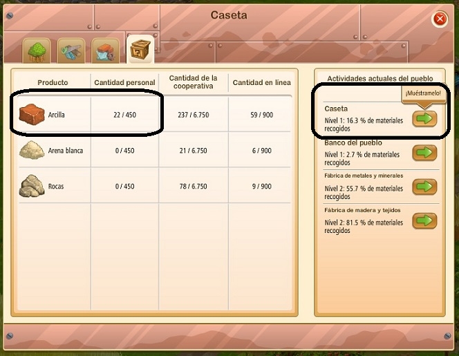 En el caso de la Arcilla realizamos los mismos pasos pero seleccionando La Mejora de la Caseta.