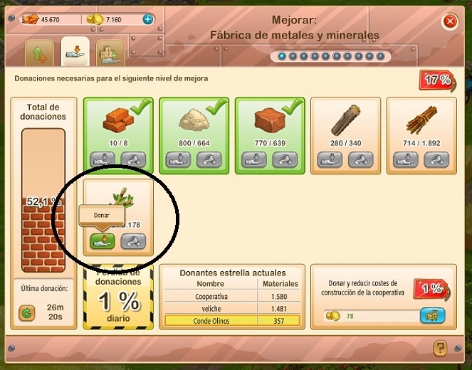 Al pinchar nos desplazaremos a la Fábrica de Metales y Minerales, nos aparece una ventana en la que podremos donar/aportar los diferentes materiales necesarios para la construcción.
