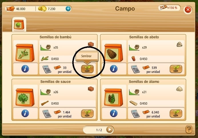 Verás aparecer un menú con todas tus plantas disponibles y recuerda comprobar la cantidad que conseguirás porque cuanto antes siembres las semillas, más madera conseguirás y comprobar también los costes de producción (que se pagan a partir de los dólares del pueblo que has cambiado previamente en el banco).