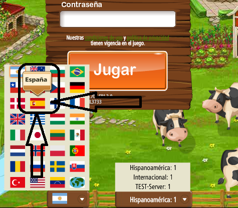 Entra al juego por la parte que te indico con las flechas rojas y elije en la parte inferior, la bandera Española y el server ES1