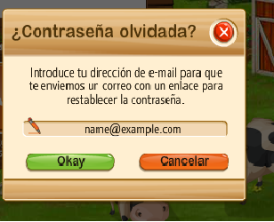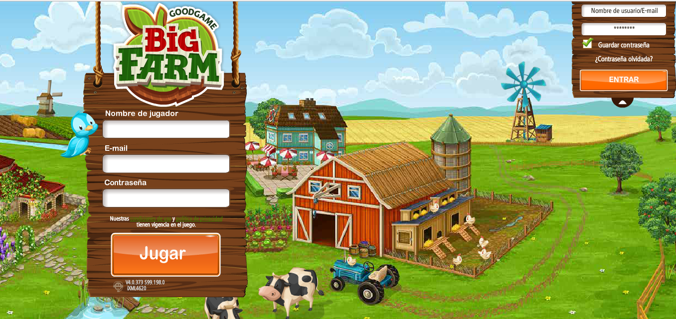 en la pantalla inicial de Big Farm, arriba en el rincón derecho verás un recuadro. Desmarca la opción que pone "guardar contraseña". Después de eso verás que debajo de esa línea pone "¿contraseña olvidada?", clicalo y te saldrá lo siguiente: