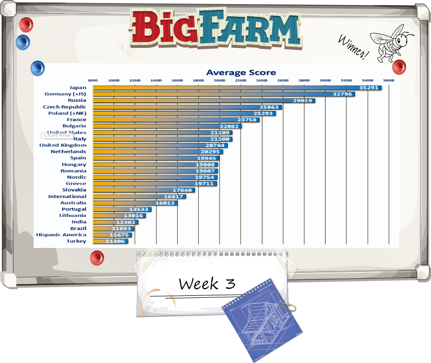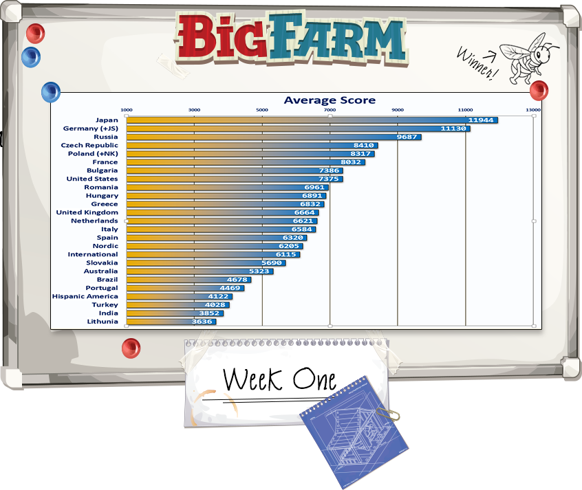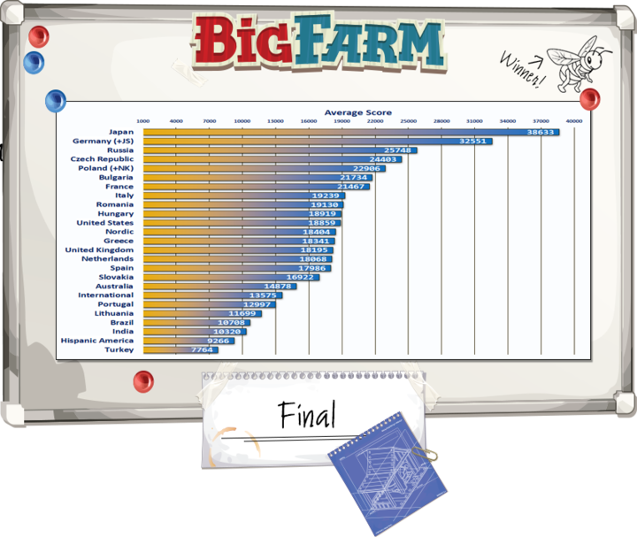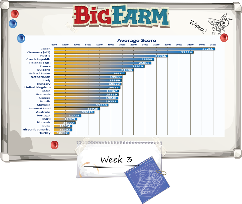 Estos son los gráficos que nos han pasado esta mañana con la información más reciente sobre el campeonato mundial de Big Farm: