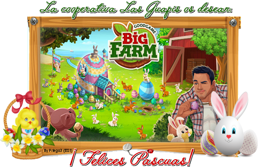 Buenas tardes.Quiero desear unas muy Felices Pascuas a todos los jugadores de Big Farm, a los moderadores,a las coperativas y en especial a tod@s mis compañer@s de mi coperativa.VIVA JEDIS.