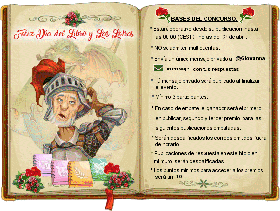 Recuerda que, las respuestas son mediante mensaje privado a mi buzón de correo: @Giovanna, que tus respuestas se publicarán al finalizar el concurso y que cualquier publicación en este hilo o en mi muro, quedarán descalificadas.