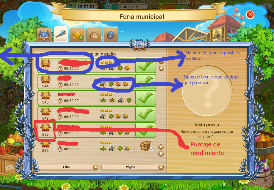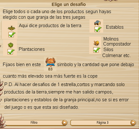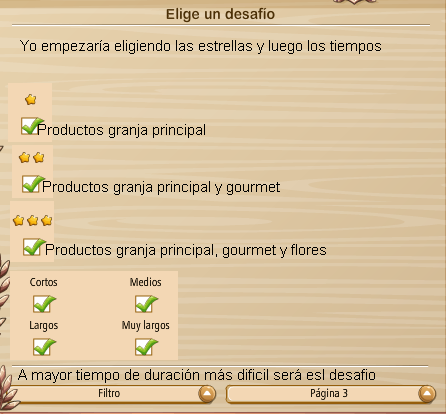 aqui podeis elegir que tipo de desafio quereis podeis elegir si solo quereis campos,para eso señalar solo los campos y los 4 productos que os pediran seran sobre cultivos,o si quereis campos y establos ,podeis elegir aunque no los productos que os pediran