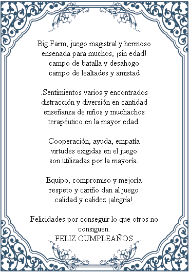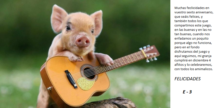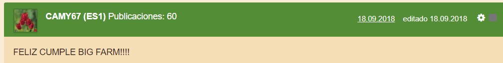 - Deja un mensaje de felicitación por el 6º aniversario de Big Farm en este hilo. Si usas imágenes de internet, como postales, haz de incluir un texto propio, para considerar válida tu publicación. (No se considera válido, publicar sólo felicidades, feliz cumpleaños o frases similares)