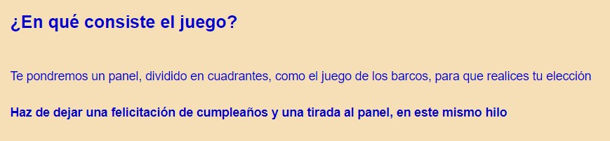 Te pondremos un panel, dividido en cuadrantes, como el juego de los barcos, para que realices tu elecciónHaz de dejar una felicitación de cumpleaños y una tirada al panel, en este mismo hilo