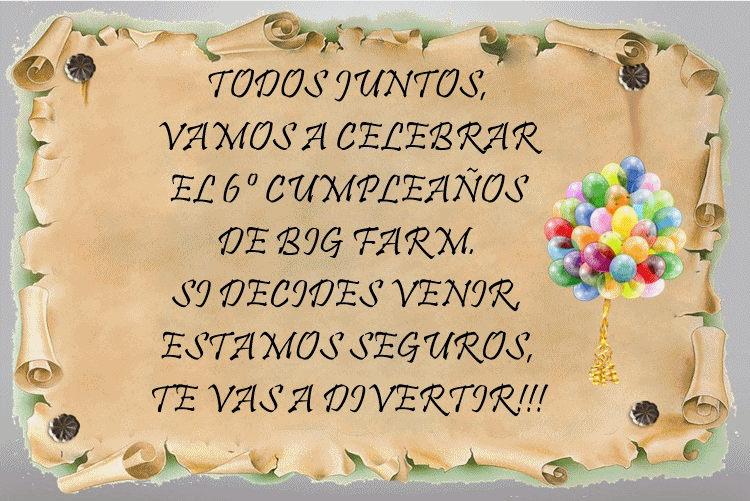 Coincidiendo con el 6º aniversario del juego de Big Farm, vamos a tener un detalle con los forer@s que nos dejen aquí su felicitación.