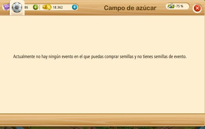 En los campos de azúcar al pinchar en "Sembrar" la ventana que se abre solo tiene la pestaña del balón de fútbol para el evento antiguo del mundial (que lógicamente esta vacía). La otra ventana, en la que puedes elegir el que sembrar no aparece, por lo que no puedo sembrar nada.