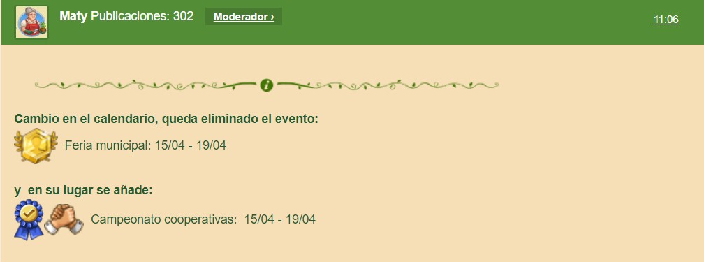 Este último cambio en el calendario de eventos que he escrito esta mañana, yo lo he añadido cuando nos lo han comunicado a nosotros. Acto seguido ¿os podéis imaginar cual ha sido la reacción de todos los moderadores verdad? un completo y total desacuerdo a ese cambio, estamos todos en contra de ese cambio, por eso algunos moderadores no lo han añadido todavía en sus propios foros. Si el lunes se discute el tema, yo estaré más que contenta de volver a cambiar el calendario y dejarlo como estaba antes de esta mañana porque les hemos dicho por activa y por pasiva que no gusta a nadie esa cantidad de campeonatos de cooperativas mensuales.